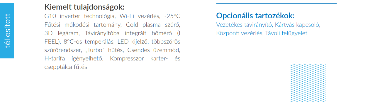 Felszerelés és beüzemelés díja bruttó 55.000 Ft, mely tartalmazza a kiszállást, a készülék helyszínre szállítását, a kültéri és beltéri egység felszerelését, elektromos betáp kiépítését aljzatba max. 5 méterig*, a kültéri tartókonzolt, rögzítő elemeket, a vákuumozást, a berendezés beüzemelését és azzal kapcsolatos dokumentumok kitöltését (pl.: beüzemelési jegyzőkönyv, garanciajegy...), valamint a takarítást.